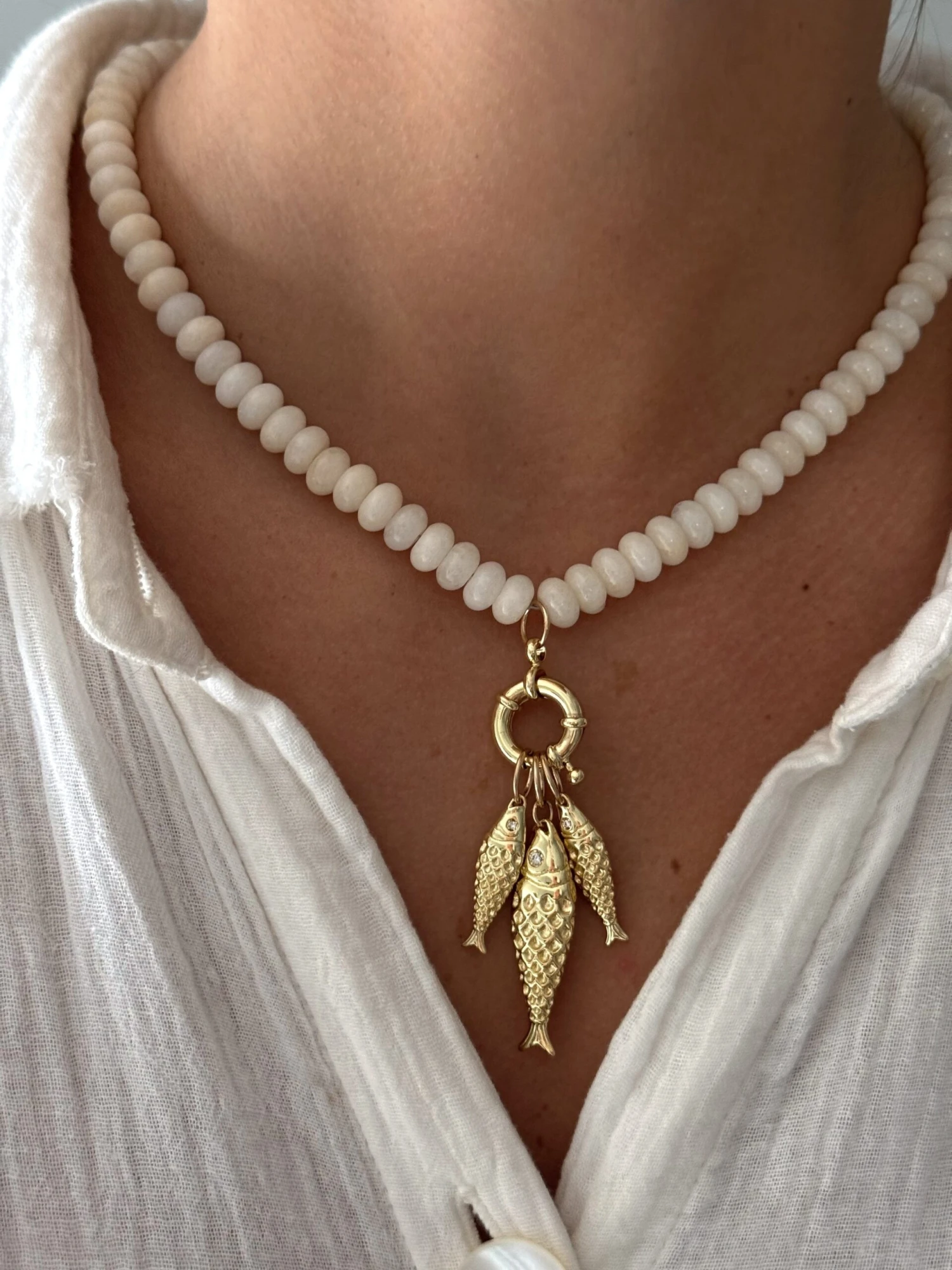 Three fish paired on a creamy gemstone beaded necklace