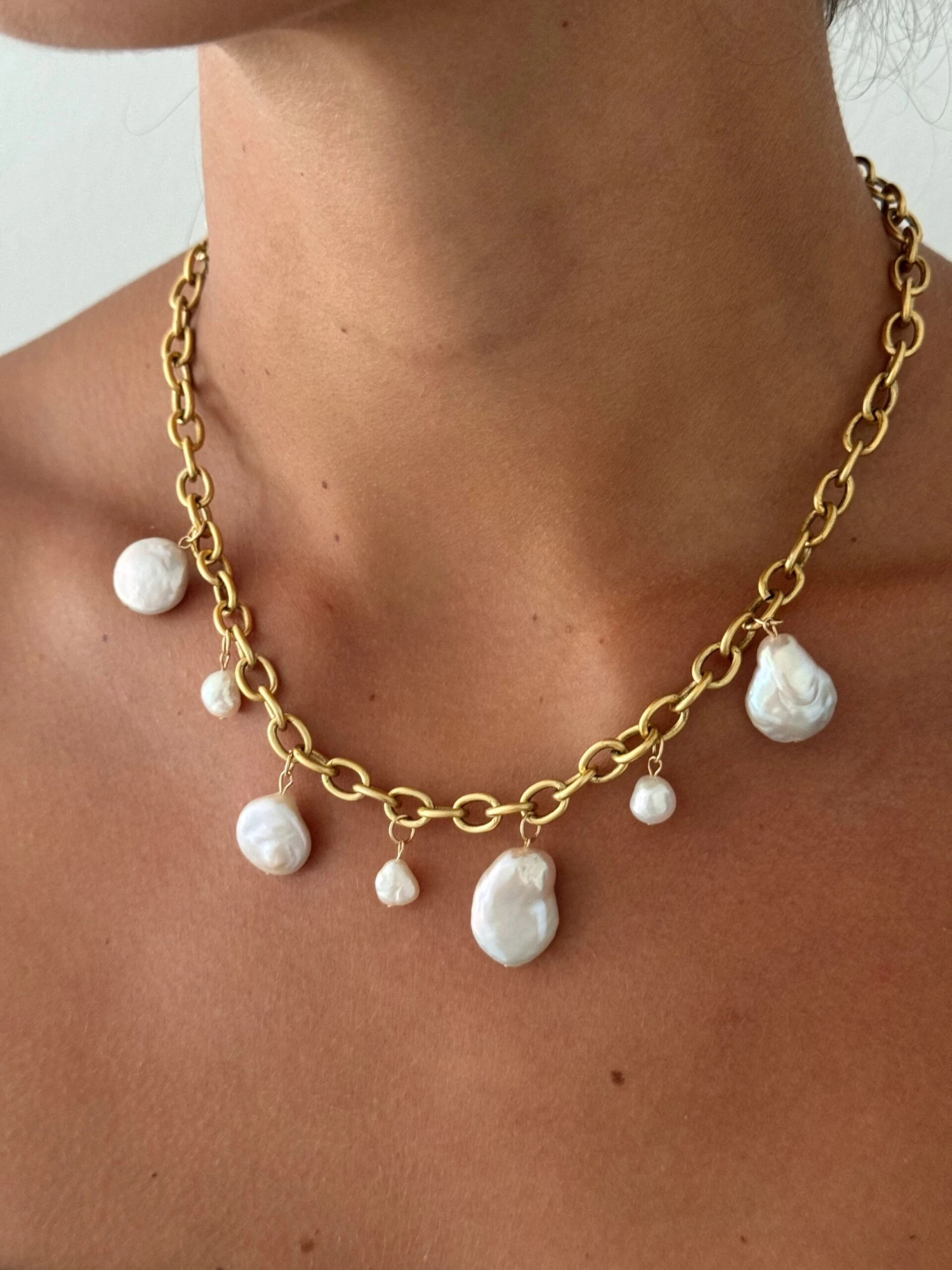 Antiqued gold necklace with freshwater pearl drops, 16in