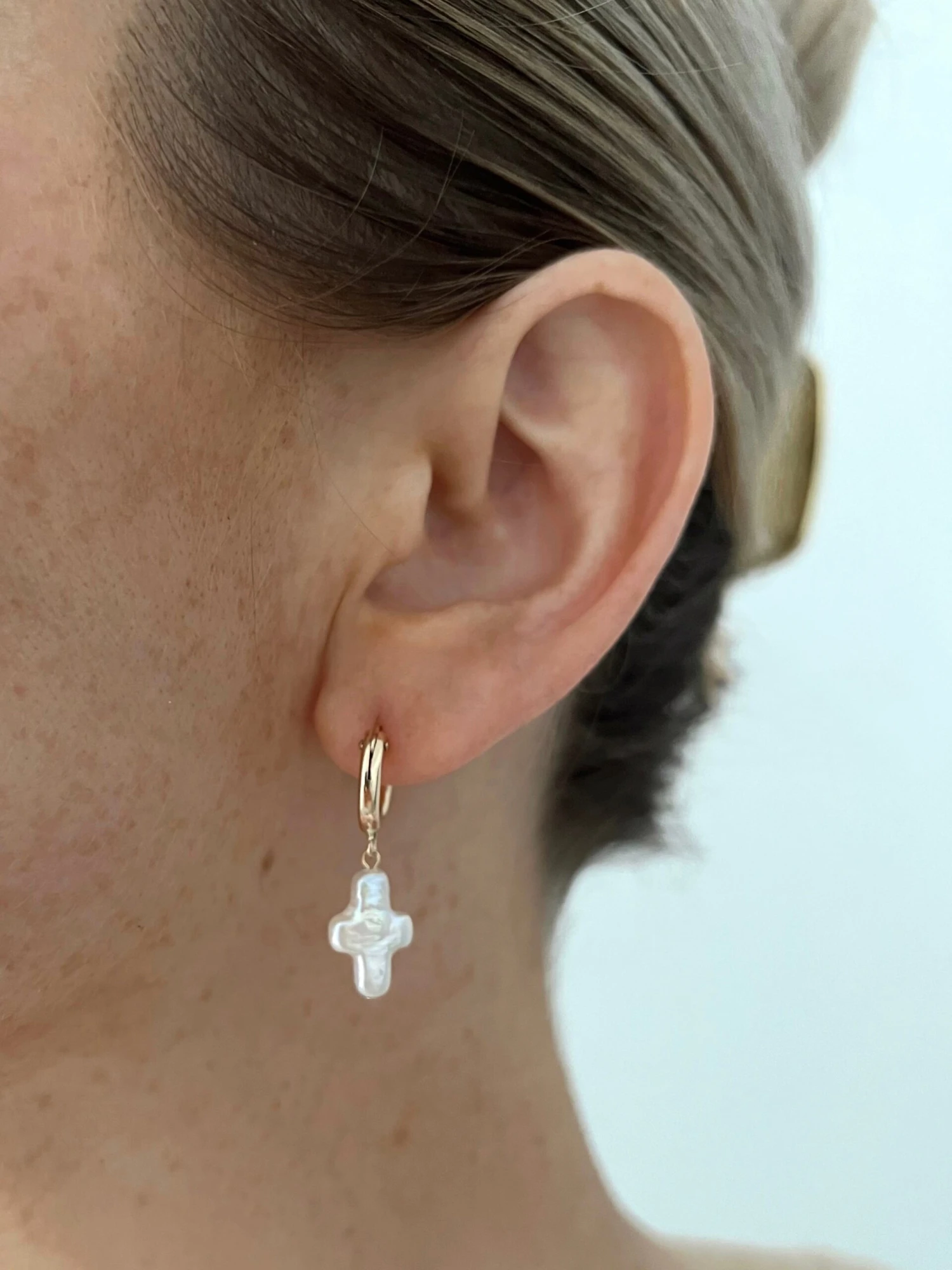 14k gold filled hoops with freshwater pearl cross