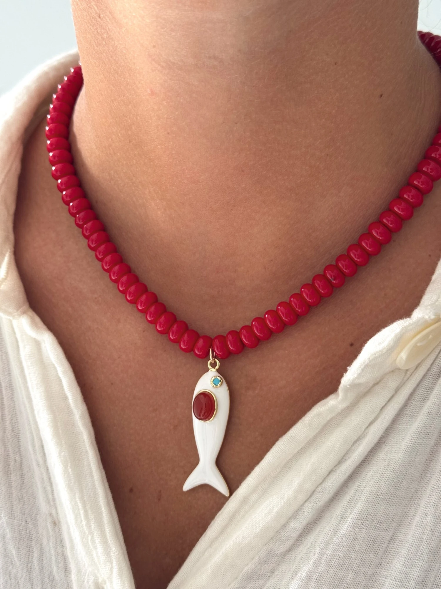 SKU: YWX2A 7950740226101 Category: Necklaces Tags: Bead, Beaded, Beads, Charm necklace, Fall, Fall jewelry, Fall necklace, Fish, Fisher man core, Fisherman core, Gemstone fish, Necklace, Necklaces